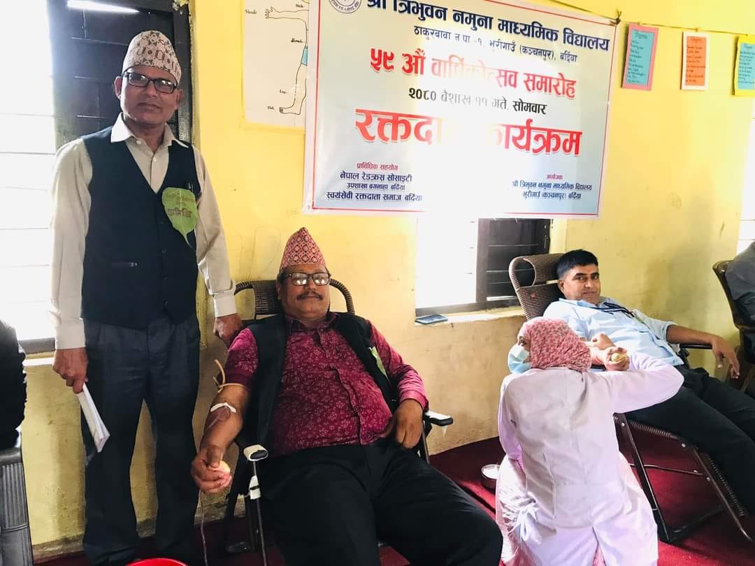 त्रिभुवन नमुना माध्यामिक विद्यालयमा भुरीगाँउमा रक्तदान कार्यक्रम गरिएको छ । विद्यालयको ५९ औं वार्षिक उत्सवको अवसरमा रक्तदान कार्यक्रम गरिएको हो ।
