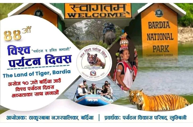 प्रत्येक वर्ष सेप्टेम्बर २७ मा संसारभरि विश्व पर्यटन दिवस विभिन्न कार्यक्रम गरी मनाउँदै आइएको छ । यस वर्ष विश्व पर्यटन दिवस लुम्बिनी प्रदेशको प्रमुख पर्यटकीय स्थलको रुपमा रहेको बर्दिया राष्ट्रिय निकुञ्ज नजिक गर्न लागिएको ठाकुरबाबा नगरपालिकाका प्रमुख प्रशासकीय अधिकृत रामहरी रिजालले बताउनु भयो । उहाँले ठाकुरबाबा नगरपालिकामा रहेको बर्दिया राष्ट्रिय निकुञ्ज, एक पिलरको कर्णाली पुल, गेरुवा गाउँपालिकामा रहेको ओखरिया इन्टेक, गुलरिया नगरपालिकामा रहेको कृष्णसार, बारबर्दियामा रहेको सत्खलुवा ताल, बाँसगढीमा रहेको केदारेश्वर धाम, च्यामा ताल, बबई भ्याली, बढैयाताल गाउँपालिकामा रहेको बढैयाताल, लगायतको स्थानको प्रचारप्रसार गर्ने उद्देश्यले कार्यक्रम गर्न लागिएको आज गरिएकाे पत्रकार सम्मेलनमा जानकारी दिनु भयो ।