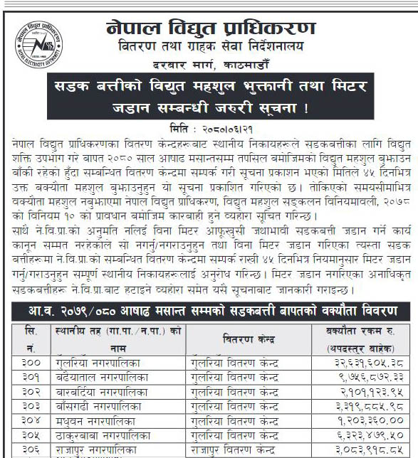 नेपाल विद्युत प्राधिकरणले स्थानीय तहले असार मसान्तसम्म बुझाउनु पर्ने बाँकी रकम ४५ दिनभित्र बुझाउन सूचना जारी गरेको छ । त्यसैगरी नेपाल विद्युत प्राधिकरणको स्विकृति विना आफू खुसी जथाभावि सडक बत्ति जडान गर्ने कार्य कानून सम्मत नभएकोले सो नगर्न नगराउन हुन तथा विना मिटर जडान गरिएका त्यस्ता सडकबत्तिहरु नेपाल विद्युत प्राधिकरणसँग सम्पर्क राखी ४५ दिनभित्र निमयानुसार मिटर जडान गर्न स्थानीय निकायलाई अनुरोध गरेको छ ।