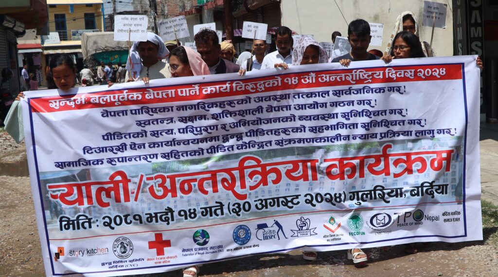 बेपत्ता पार्ने कार्य विरुद्धको १४ औं अन्तर्राष्ट्रिय दिवसको अवसरमा अन्तरक्रिया तथा ¥याली प्रदर्शन गरिएको छ।  बेपत्ता पारिएको व्यक्तिहरुको अवस्था तत्काल सार्वजनिक हुनुपर्ने, तथा स्वतन्त्र सक्षक र शक्तिशाली वेपत्ता आयोग गठन हुनुपर्ने माग सहित  अन्तरक्रिया तथा ¥याली प्रदर्शन गरिएको थियो । कार्यक्रम द्वन्द्व पीडित समिती, अनौपारिक सेवा ( इन्सेक ), नेपाल पत्रकार महासंघ, द किचन स्टारी, बर्दिया जिल्ला अदालत बार एसोसियसन,  थारु महिला उत्थान केन्द्र, बर्दिया नागरिक समाज सञ्जाल, नेपाल रेडक्रम सोसाइटी शाखा,  वन उपभोक्ता महासंघ, सीएमसी नेपाल एड्भोकेशी फोरम, टिपिओ नेपाल लगायतको संस्थाको आयोजनामा कार्यक्रम भएको थियो ।