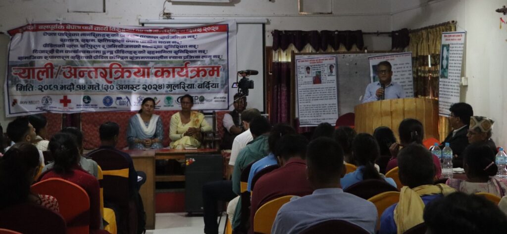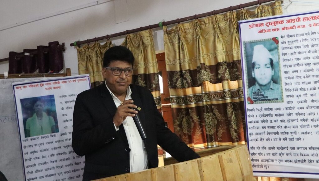 खुकुरीको चोट अचानोलाई मात्र थाहा हुन्छ भने पीडितले भोगेको बारेमा हामीले अनुभव गर्न नसके पनि  पीडितको सुखदुःखमा बार सधै उभिने बर्दिया जिल्ला अदालत बार एसोसियसनका अध्यक्षले बताउनु भयो । उहाँले गम्भीर मानव अधिकार उल्घंनका विषयमा कसैलाई छुट पाउने नहुने बताउनु भयो । उहाँले भन्नुभयो, ‘ सरकारले पनि बेपत्ता पारिएका ब्यक्तिको छानविन, सत्य निरुपण तथा मेलमिलाप आयोग ऐन २०७१ संशोधन विधेयक प्रतिनिधी सभाले पास गरेर राष्ट्रपतिको कार्यालयले प्रमाणीकरण गरि सकेकोले बेपत्ताको र द्वन्द्व क्रममा भएको गम्भीर मानव अधिकार उल्लघंनमा न्याय पाउने सक्ने बाटो खुलेको बताउनु भयो ।