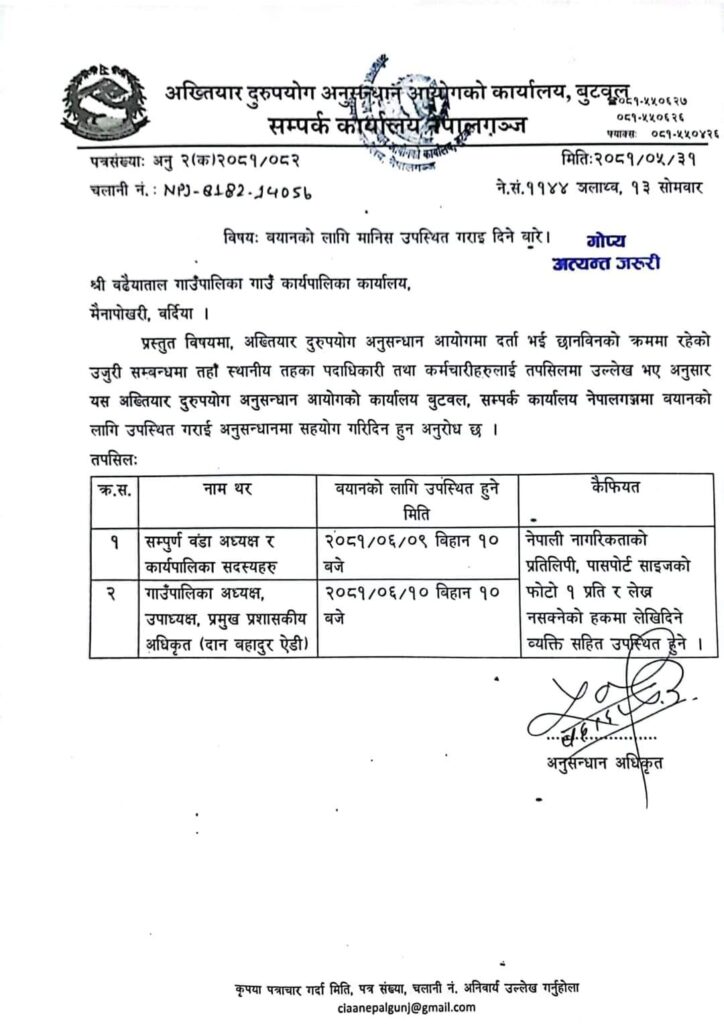 प्रकाश पौडेल, गुलरिया ।अख्तियार दुरुपयोग अनुसन्धान आयोगको कार्यालय बुटवल सम्पर्क कार्यालय नेपालगञ्जले जनप्रतिनिधि तथा प्रमुख प्रशासकीय अधिकृत बयानको बोलाएको छ । आयोगको कार्यालयले बढैयाताल गाउँपालिकाका अध्यक्ष, उपाध्यक्ष प्रमुख प्रशासकीय अधिकृत दानबहादुर ऐडी र वडा अध्यक्ष तथा कार्यपालिका सदस्यलाई बयानको लागि बोलाएको हो ।