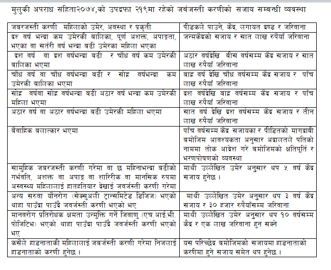 मुलुकी अपराध संहिता २०७४ को दफा २१९ मा कुनै पनि महिलालाई निजको मञ्जुरी नलिई वा मञ्जुरी लिएर भए पनि अठार वर्षभन्दा कम उमेरको कुनै बालबालिकालाई करणी गरेमा निजले पाउने त्यस्तो महिला वा बालिकालाई जबर्जस्ती करणी गरेको मानिने कानुनी व्यवस्था रहेको छ ।
