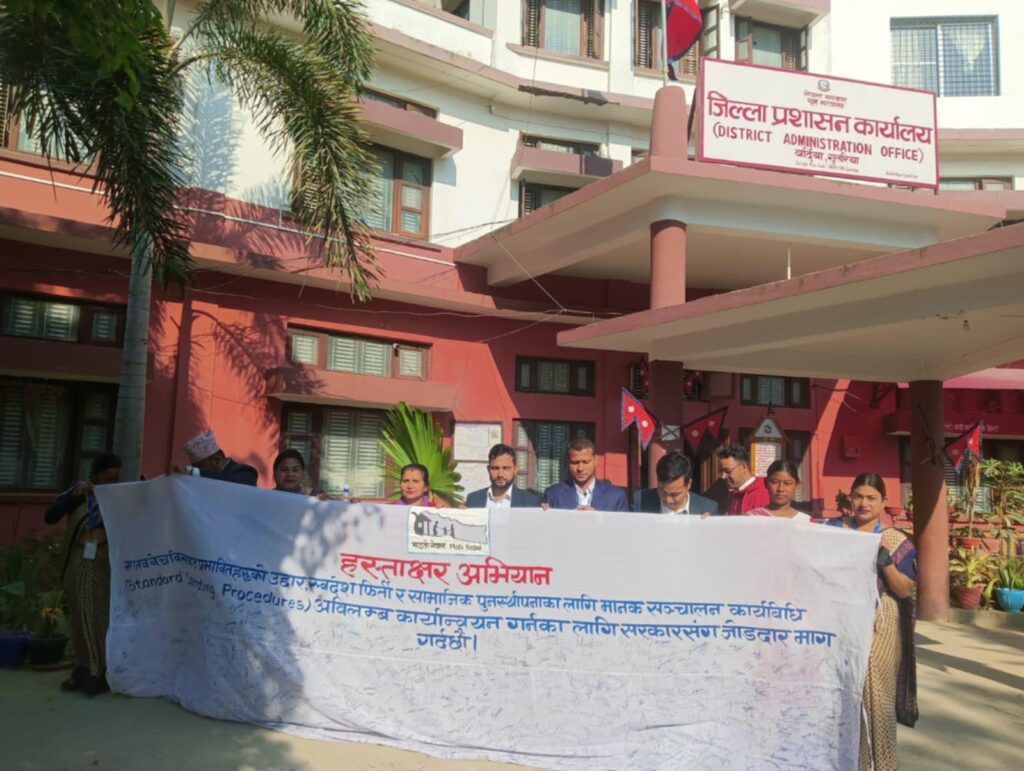 माइती नेपालले विभिन्न जिल्लामा “मानव बेचविखनबाट प्रभावितहरुको उद्धार, स्वदेश फिर्ति र सामाजिक लागि “मानक संचालन कार्यविधि” (Standard Operating Procedure) हस्ताक्षर अभियान संचालनमा ल्याई उक्त कार्यविधि अविलम्ब कार्यन्यन गर्नका लागि जिल्ला प्रशासन कार्यालयको ध्यानाकर्षण गराउँदै जिल्लामा रहेको मानव बेचबिखन तथा ओसारपसार नियन्त्रण जिल्ला समिति मार्फत नेपाल सरकारसँग “स्वदेश फिर्ति कार्यविधि” कार्यावन्यन गराउन देशव्यापी रूपमा कार्यक्रम गरिरकेकोकार्यकम संयोजक रिमाल जानकारी दिनुभयो ।