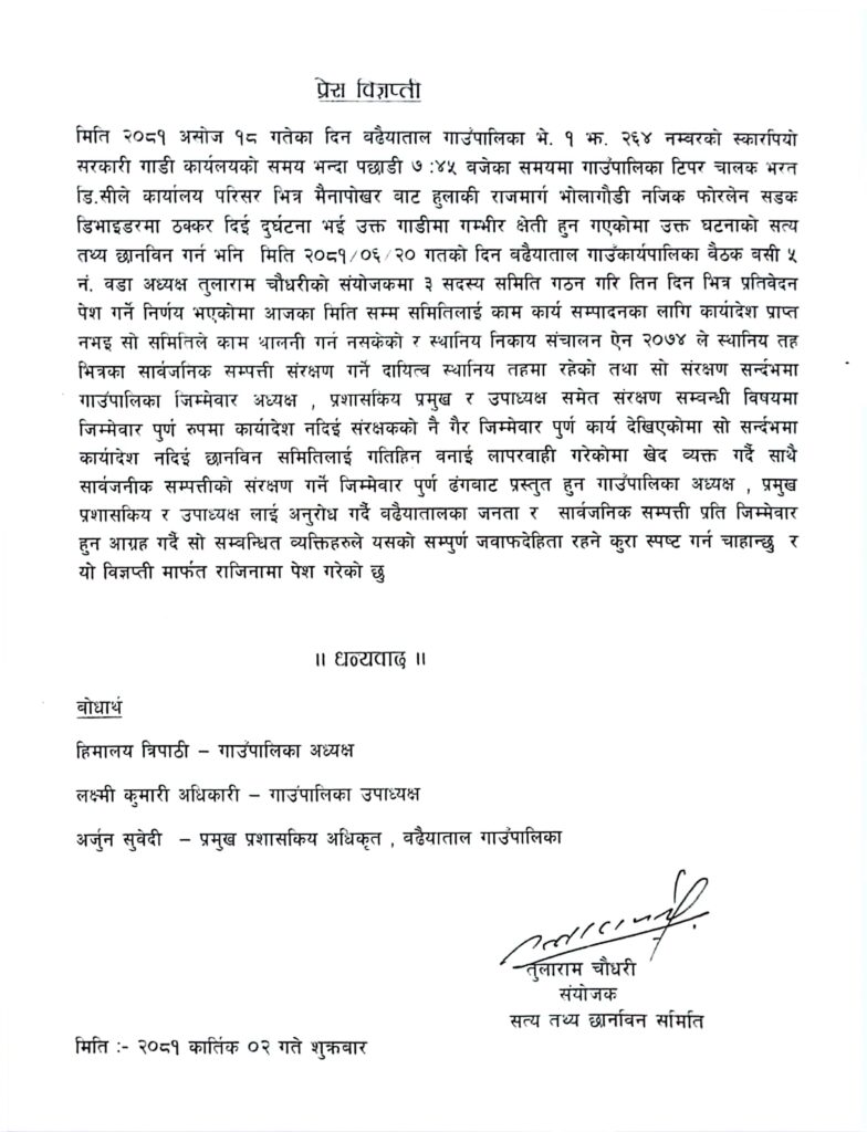 छानविन समितिका संयोजक चौधरीले जारी गरेको विज्ञप्तिमा भनिएको छ – ‘स्थानीय निकाय सञ्चालन ऐन २०७४ ले स्थानीय तहभित्रका सार्वजनिक सम्पत्तिको संरक्षण गर्ने दायित्व स्थानीय तहमा रहेको तथा सो संरक्षण सन्दर्भमा  गाउँपालिका जिम्मेवार अध्यक्ष, प्रशासकीय अधिकृत र उपाध्यक्ष समेत संरक्षण सम्बन्धी विषयमा जिम्मेवार पूर्ण रुपमा कार्यादेश नदिई संरक्षकको नै गैर जिम्मेवार पूर्ण कार्य देखिएकोमा सो सन्दर्भमा   कार्यादेश नदिई छानविन समितिलाई गतिहीन बनाइ लापरवाही गरेकोमा खेद व्यक्त गर्दै साथै सार्वजनिक सम्पत्तिको संरक्षण गर्नपर्ने जिम्मेवार पूर्ण ढङ्गबाट प्रस्तृत हुन गाउँपालिका अध्यक्ष, प्रमुख प्रशासकीय अधिकृत र उपाध्यक्षलाई अनुरोध गर्दै बढैयाताल गाउँपालिका जनता र सार्वजनिक सम्पत्ति प्रतिको जिम्मेवार हुन आग्रह गर्दै सो सम्बन्धित व्यक्तिहरूले यसको सम्पूर्ण जवाफदेहिता रहने  कुरा स्पष्ट गर्न चाहन्छु र यो विज्ञप्ति मार्फत राजिनामा पेश गरेको छु ।’