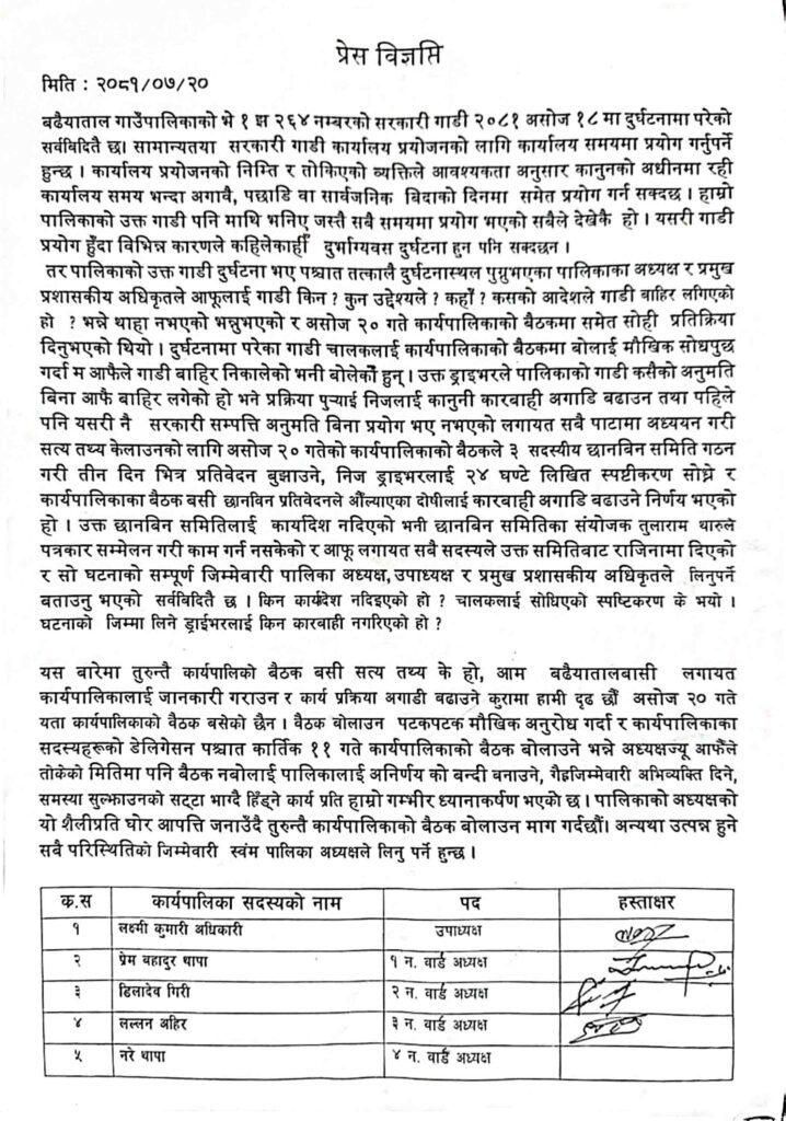 दुर्घटनामा परेका गाडी चालकलाई कार्यपालिकाको बैठकमा बोलाई मौखिक सोधपुछ गर्दा म आफैले गाडी बाहिर निकालेको भनी बोलेको हुन्। उक्त ड्राइभरले पालिकाको गाडी कसैको अनुमति बिना आफै बाहिर लगेको हो भने प्रक्रिया पुरÞ्याई निजलाई कानुनी कारबाही अगाडि बढाउन तथा पहिले पनि यसरी नै सरकारी सम्पत्ति अनुमति बिना प्रयोग भए नभएको लगायत सबै पाटामा अध्ययन गरी सत्य तथ्य केलाउनको लागि असोज २० गतेको कार्यपालिकाको बैठकले ३ सदस्यीय छानबिन समिति गठन गरी तीन दिन भित्र प्रतिवेदन बुझाउने, निज ड्राइभरलाई २४ घण्टे लिखित स्पष्टीकरण सोध्ने र कार्यपालिकाका बैठक बसी छानविन प्रतिवेदनले औंल्याएका दोषीलाई कारबाही अगाडि बढाउने निर्णय भएको हो ।