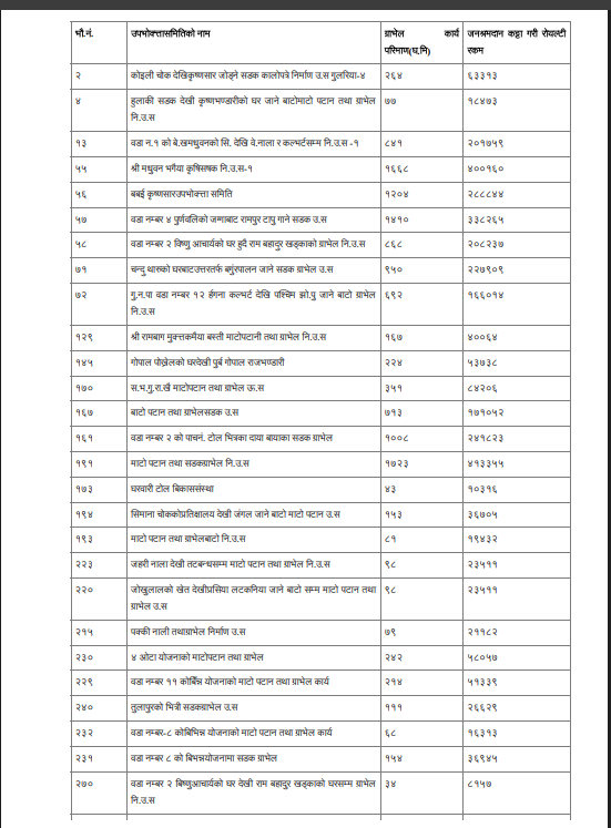 त्यसैगरी ग्राभेल कार्यमा समावेश भएको प्रति घनमिटर रोयल्टी २८२. २४ रुपैयाँको दरले  समितिलाई कालोपत्रे र पक्की नाला तथा ग्राभेल कार्यमा ५ र १५ प्रतिशत र सडक बोर्ड तर्फ १० प्रतिशतले जनश्रमदान बापत रकम कट्टा गरिएको भएपनि पालिकाले ४८ लाख ६७ हजार ४ सय ३१ रुपैयाँ बढी भुक्तानी दिएकोले रोयल्टी बापतको रकम उपभोक्ता समितिबाट असुल गर्ने प्रतिवेदनमा भनिएको छ ।