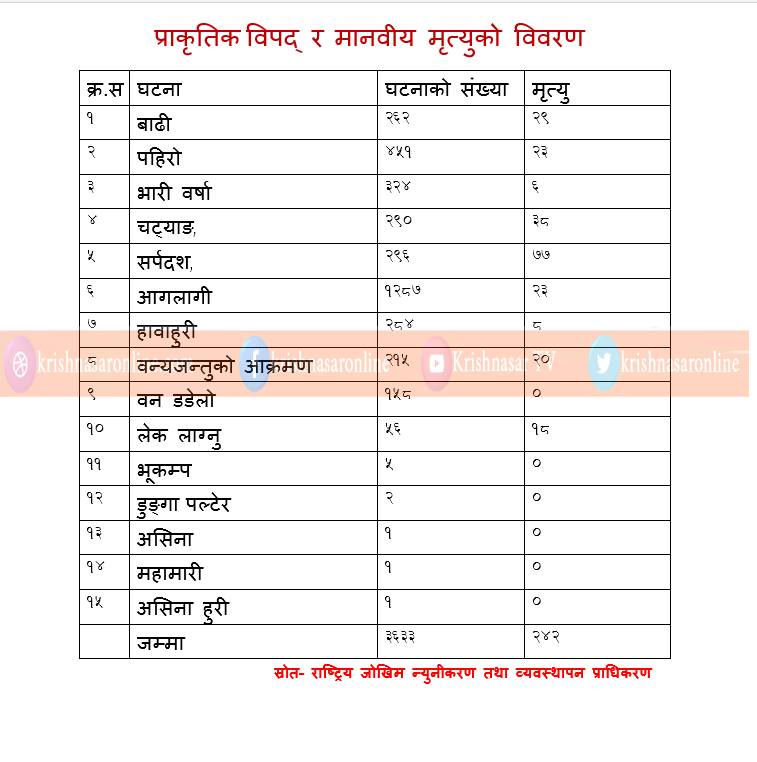 कृष्णसार अनलाइन । देशभर आएको प्राकृतिक विपदमा परी ५ महिनामा दुई सय ४२ जनाको मृत्यु भएको छ । बाढी, पहिरो, भारी वर्षा, चट्याङ, सर्पदंश, आगलागी, हावाहुरी, वन्यजन्तुको आक्रमण, लेक लागेर ५ महिनामा दुई ४२ जनाको मृत्यु भएको हो ।