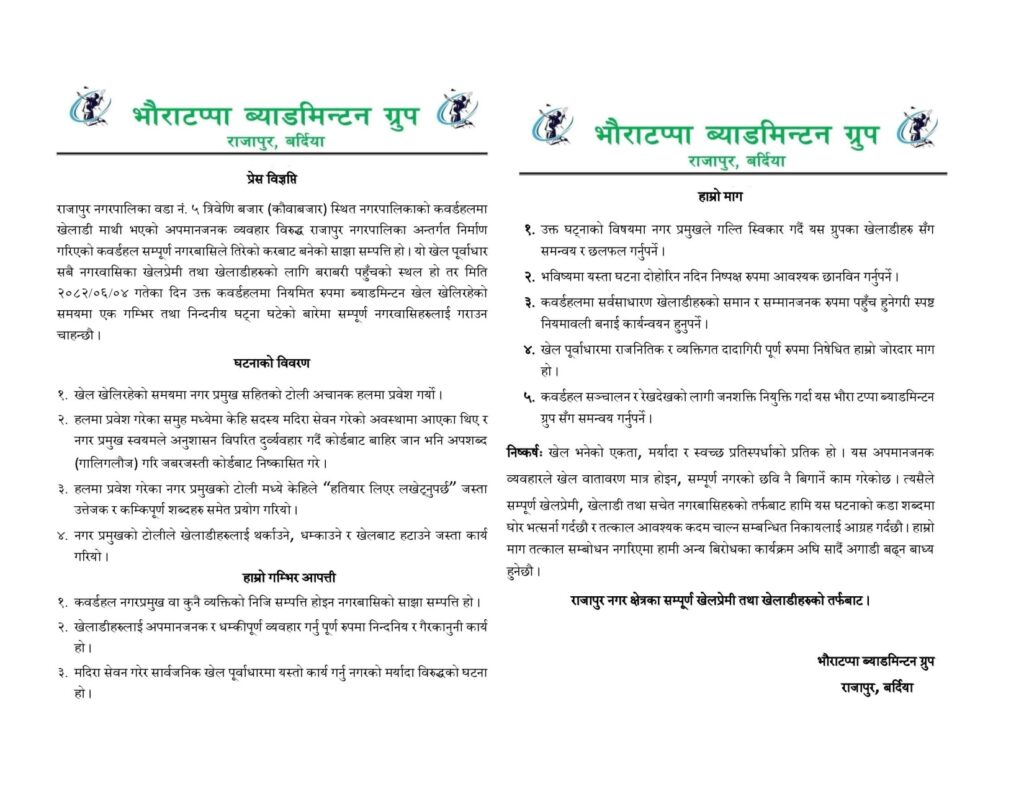 असोज ४ गते साँझ स्थानीय खेलाडीको बीचमा मैत्रीपूर्ण खेल भइरहेको समयमा नगरप्रमुख आएर खेलाडीलाई दुर्व्यवहार गरेको थिए। सो घटनाको विरोधमा भौराटप्पा ब्याडमिन्टन ग्रुप राजापुरले १३ असोजमा प्रेस विज्ञप्ति निकालेको हो।