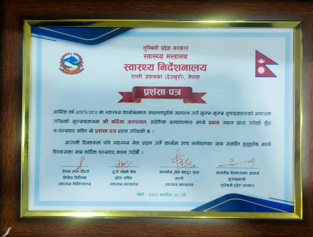 कार्यसम्पादन मूल्याङ्कनमा बर्दिया अस्पताल लुम्बिनी प्रदेशमा पहिलो
