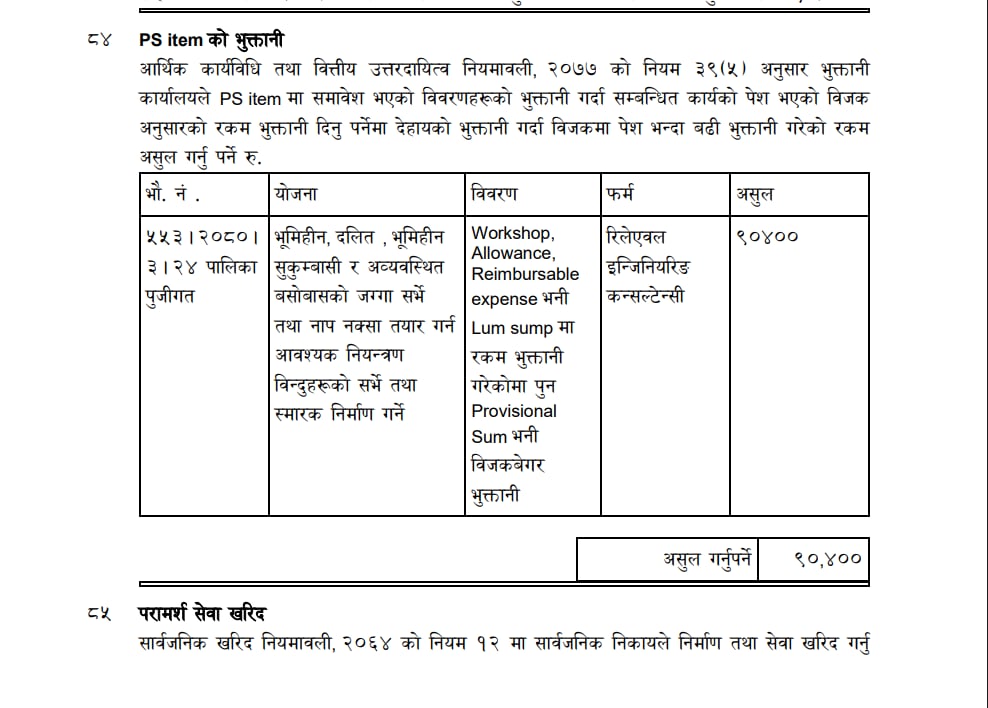 पालिकाले भूमिहीन, दलित, भूमिहीन सुकुम्बासी र अव्यवस्थित बसोबासको जग्गा सर्भे तथा नाप नक्सा तयार गर्ने आवश्यक नियन्त्रण विन्दुहरू सर्भे तथा स्मारक निर्माण गर्ने काम गर्दा बिल बिजक भन्दा बढी भुक्तानी ९० हजार चार सय रुपैयाँ असुलउपर गर्नुपर्ने महालेखा परीक्षकको प्रतिवेदनमा उल्लेख गरिएको छ ।