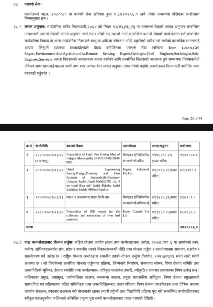 परामर्श खरिद गर्दा कम्तीमा पनि तीनवटा परामर्शदाता प्रस्ताव पेस गर्नुपर्ने भएकोले त्यसवेला परामर्श खरिदको काम रोकिएको थियो । पछि पालिका अर्को सूचना प्रकाशन नगरेर पालिकाका कर्मचारीहरूको मिलेमतोमा आन्तरिक रूपमै कागजात मिलाएर विशिष्टीकृत जग्गाको वर्गीकरणको काम कर्मचारी अमिन रिजालको श्रीमतीको नाममा रहेको रिलेएबल इन्जिनियरिङ कन्सल्टेन्सीलाई परामर्शको काम दिइएको थियो । विशिष्टीकृत जग्गाको वर्गीकरणको काम  गरेबापत पालिकाबाट १९ लाख ५० हजार पाँच सय भुक्तानी भएको देखिन्छ ।
