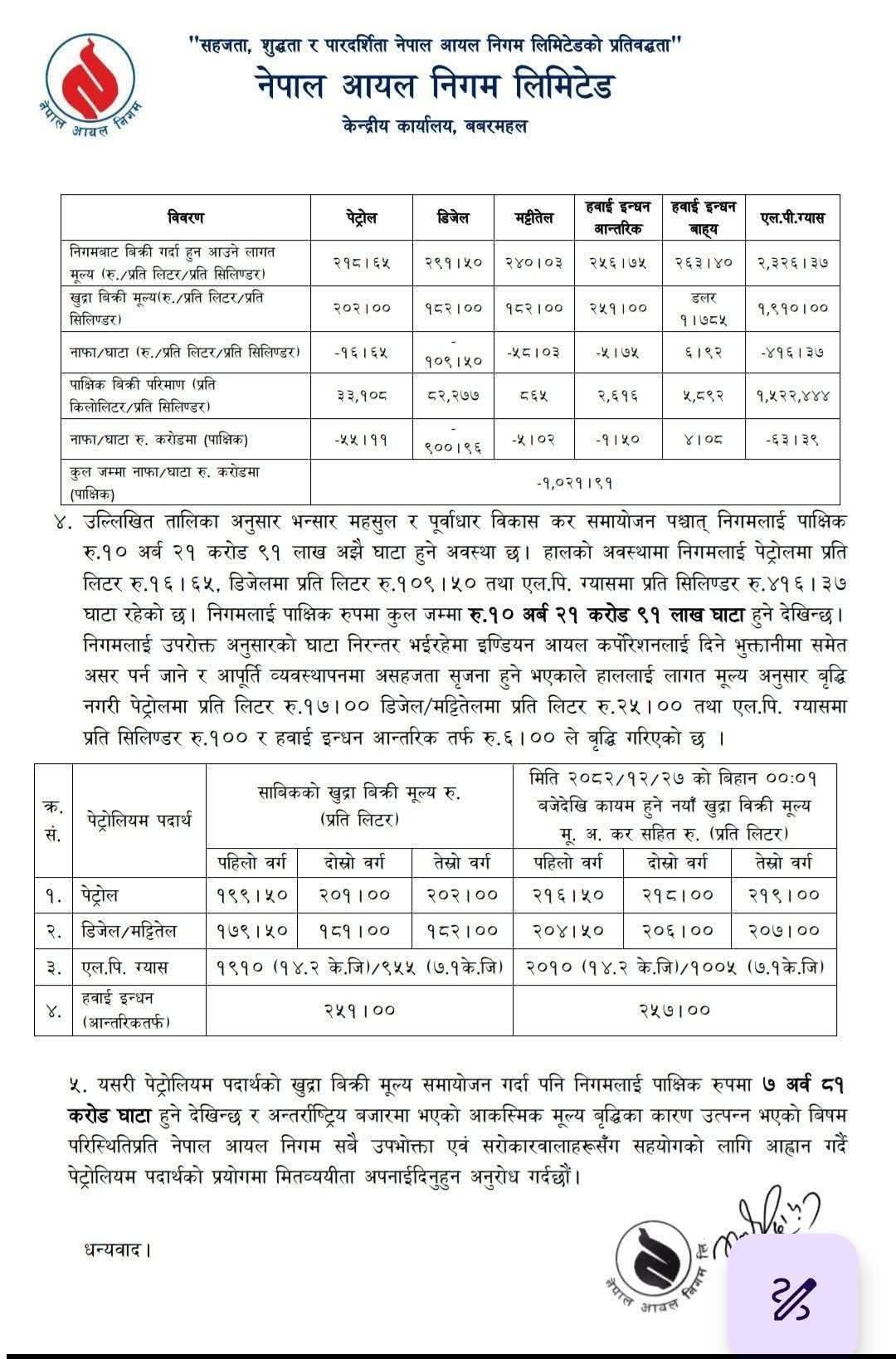नेपाल आयल निगमले चैत २७ गतेबाट लागू हुने गरी पेट्रोलमा प्रतिलिटर १७ रुपैयाँ डिजेल र मट्टितेलमा प्रतिलिटर ५५ रुपैयाँ, हवाइ इन्धन आन्तरिक तर्फ प्रतिलिटर ६ रुपैयाँ र ग्यासमा एक सय रुपैयाँमा बढाएको छ ।