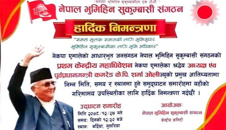 बर्दिया । नेपाल भुमिहीन सुकुम्बासी संगठनको प्रथम केन्द्रीय महाधिवेशनको तयारी तीव्र पारिएको छ । बर्दियाको गुलरियामा आयोजना हुने संगठनको प्रथम केन्द्रीय महाधिवेशनको उद्घाटन नेकपा एमालेका अध्यक्ष के.पी. शर्मा ओलीले चैत्र २४ गते उद्घाटन गर्ने कार्यक्रम रहेको छ रहेको छ ।